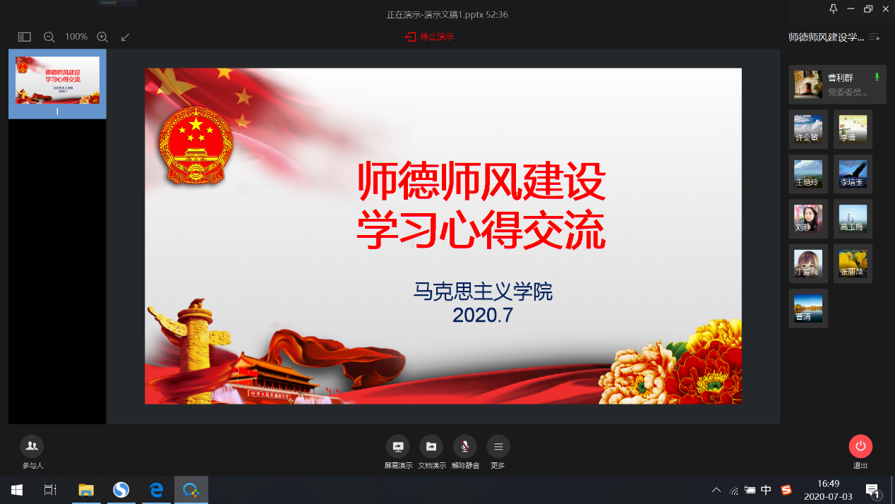 为深入贯彻落实习总书记关于教育的重要论述和全国教育大会精神,深入推进师德师风建设活动,7月3日上午,马克思主义学院召开线上师德师风建设学习心得交流会,交流会由刘静副院长主持,学院全体教师参加。