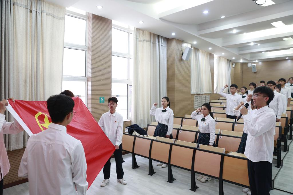 2020年新发展团员名单》,大家以热烈的掌声向新发展团员表示祝贺。随后,老团员为新团员代表佩戴团徽及颁发团员证。学特院孙佳旋同学带领91名新发展团员面向团旗庄严宣誓。
