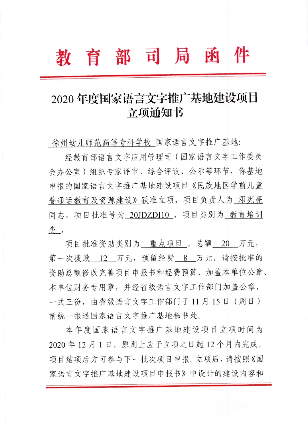 国家语言文字推广基地申报的《民族地区学前儿童普通话教育及资源建设》获批为重点项目,项目经费金额20万,批准立项号20JDZDI10, 项目类别为教育培训类 。本次有“中小学统编语文教材语言文字教育研究”等61个项目被批准立项。其中重大项目4个,重点项目21个,一般项目33个,省市共建项目3个。这是糖果派对官方