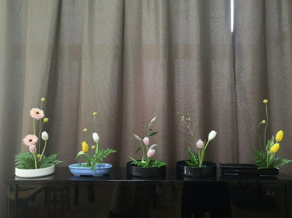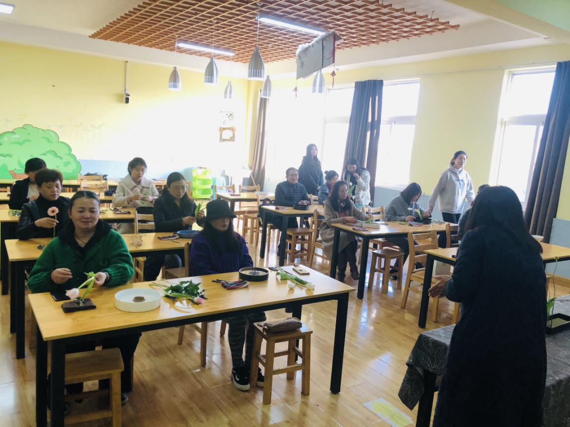 活动现场花香四溢,气氛热烈而温馨。李媛老师对东方花道的由来、花器的异同以及如何养花护花进行了讲解,介绍了花材、叶材的修剪处理,插花基本结构和基本造型技法,并为大家示范插花步骤。在插花实践环节,大家充分发挥想象和创意,将普通的鲜花和枝条创作成了婉约雅致的插花作品,令人赏心悦目。