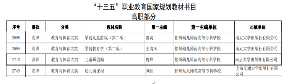 曹莉老师主编教材《学前儿童游戏》(第二版),王清风老师主编教材《学前教育学》(第二版),魏峰老师主编教材《儿童画创编》,刘曲老师主编教材《幼儿园课程》成功入选“十三五”职业教育国家规划教材书目。