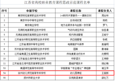 王丽新教授团队(团队成员:刘曲、孟子郁、黄丽娜、宋琛琛、王区区、李进、罗秋英)申报的《幼儿园课程》获首批江苏省高校课程思政示范课程立项。