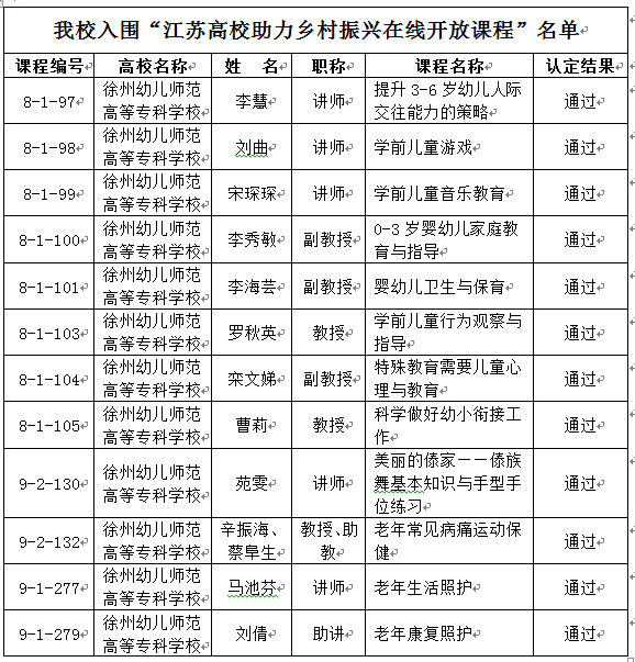 学前与特殊教育学院申报的7门课程、音乐舞蹈系申报的1门课程、体育系申报的1门课程、健康管理系申报的2门课程和继续教育学院申报的1门课程,总计12门课程通过“江苏高校助力乡村振兴在线开放课程”的评审,入围江苏高校助力乡村振兴在线开放课程。