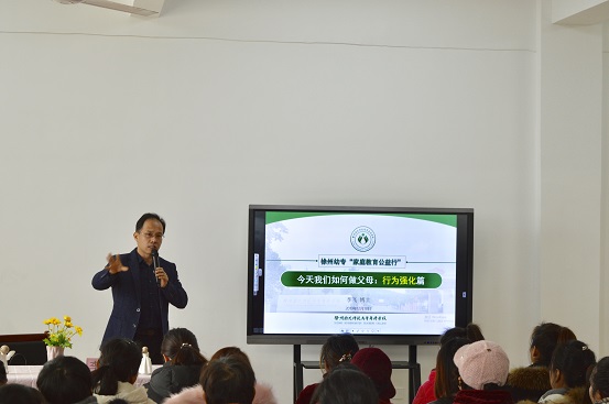 李飞博士围绕“今天我们如何做家长——行为强化篇”这一主题,结合自身的经验与研究,分析了家庭教育的功能、家庭教育存在的问题,认为孩子的任何问题都可以在家庭教育中找到一定的根源,孩子会在“自己行为——成人反应”这种行为强化中习得规则、不断成长,只有问题家长,没有问题孩子。同时针对家长普遍关心的幼儿情绪表达、成人情绪管理等问题进行了分析,提出情绪没有好坏之分,它只是人们对环境的一种反应,表达情绪的目的是为了分享沟通,而不是改变,情绪稳定,才是给孩子最好的教育。建议家长通过同感、原因分析、问题解决引导孩子学会表达情绪,如果能以适当的方式在适当的情境表达适度的情绪就是健康的情绪管理之道。在互动环节,李飞博士针对部分家长提出的问题进行了回答,强调幼儿的学习特点是观察与模仿,家长要学会言传身教、以身作则。