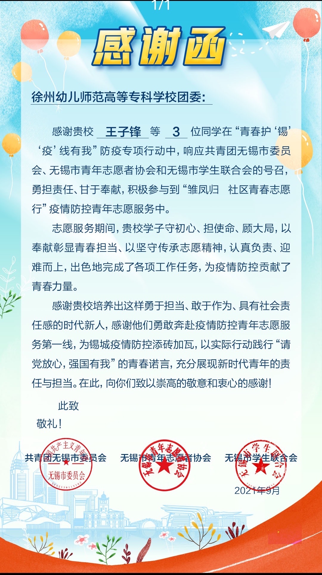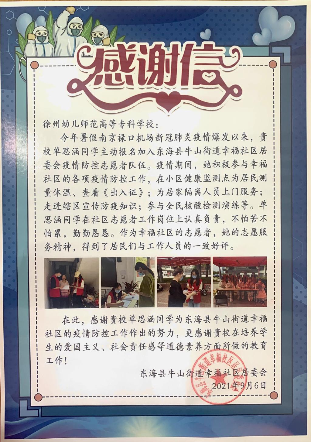 信中指出,自今年暑假南京疫情爆发以来,王子锋、单思涵等同学作为返乡大学生,积极响应地方号召,主动加入社区疫情防控志愿者队伍中。战“疫”前线,他们全力参与卡口值守、体温测量、人员信息摸排、居家隔离群众服务以及防疫知识宣传,不分昼夜同时间赛跑、与疫情较量,以青春之姿在病毒与群众间垒起“隔离带”、筑牢“防护墙”、撑起“保护伞”,出色完成各项工作任务,受到当地居民与社区工作人员的一致好评。