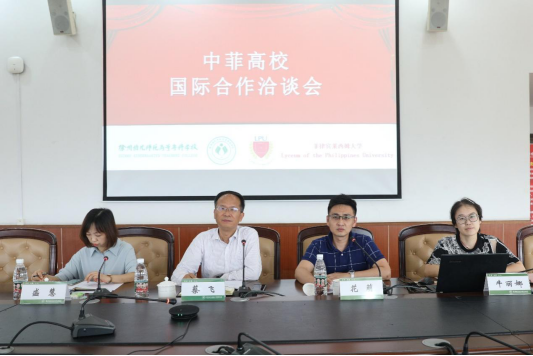 校长蔡飞、国际交流与合作处处长花萌、副处长盛慧和菲律宾莱西姆大学执行副校长Dr. Maria Teresa Pilapil、博士生导师曹学庆、研究生院院长Ramon Maniago、国际交流与合作处处长Mia Aiko Pilapil出席会议。