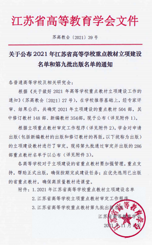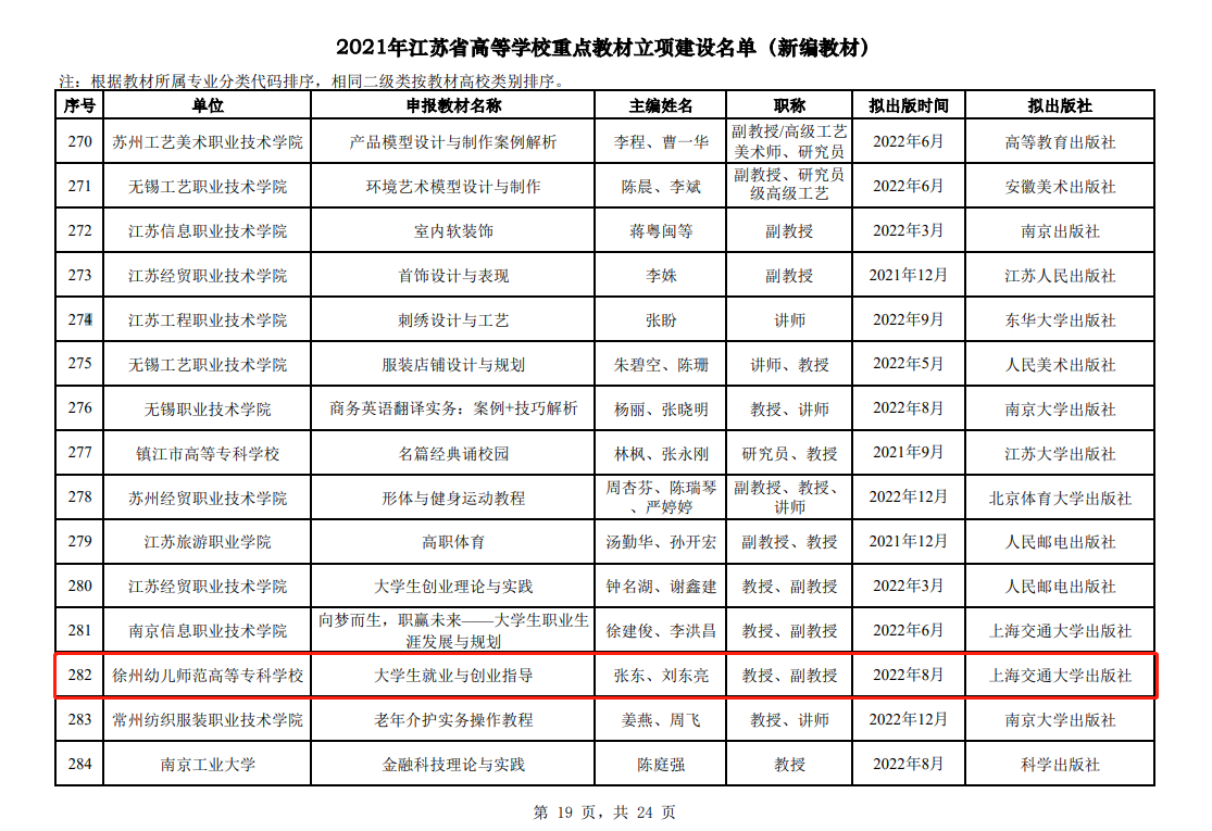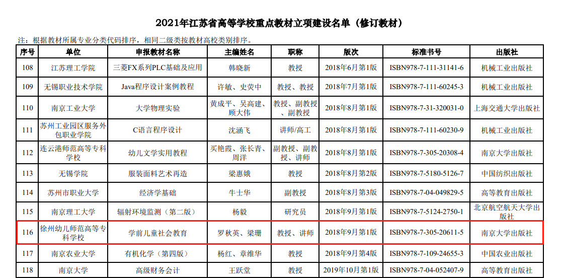 根据江苏省高等教育学会《关于公布2021年江苏省高等糖果派对官方 重点教材立项建设名单和第九批出版名单的通知》(苏高教会[2021]39号),糖果派对官方 罗秋英、梁珊老师主编的教材《学前儿童社会教育》,张东、刘东亮老师主编的教材《大学生就业与创业指导》入选2021年江苏省高等糖果派对官方 重点教材立项建设名单。