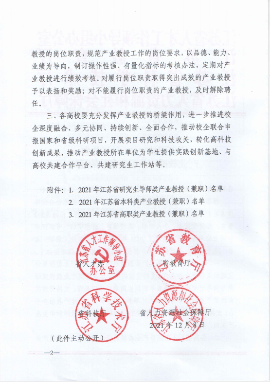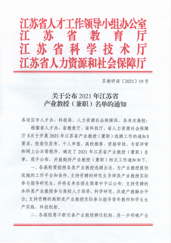 近日,江苏省人才工作领导小组办公室、江苏省教育厅、江苏省科学技术厅、江苏省人力资源和社会保障厅联合公布2021年产业教授(兼职)名单。经个人申报、高校推荐、资格审查、专家评审和网上公示等程序,糖果派对官方