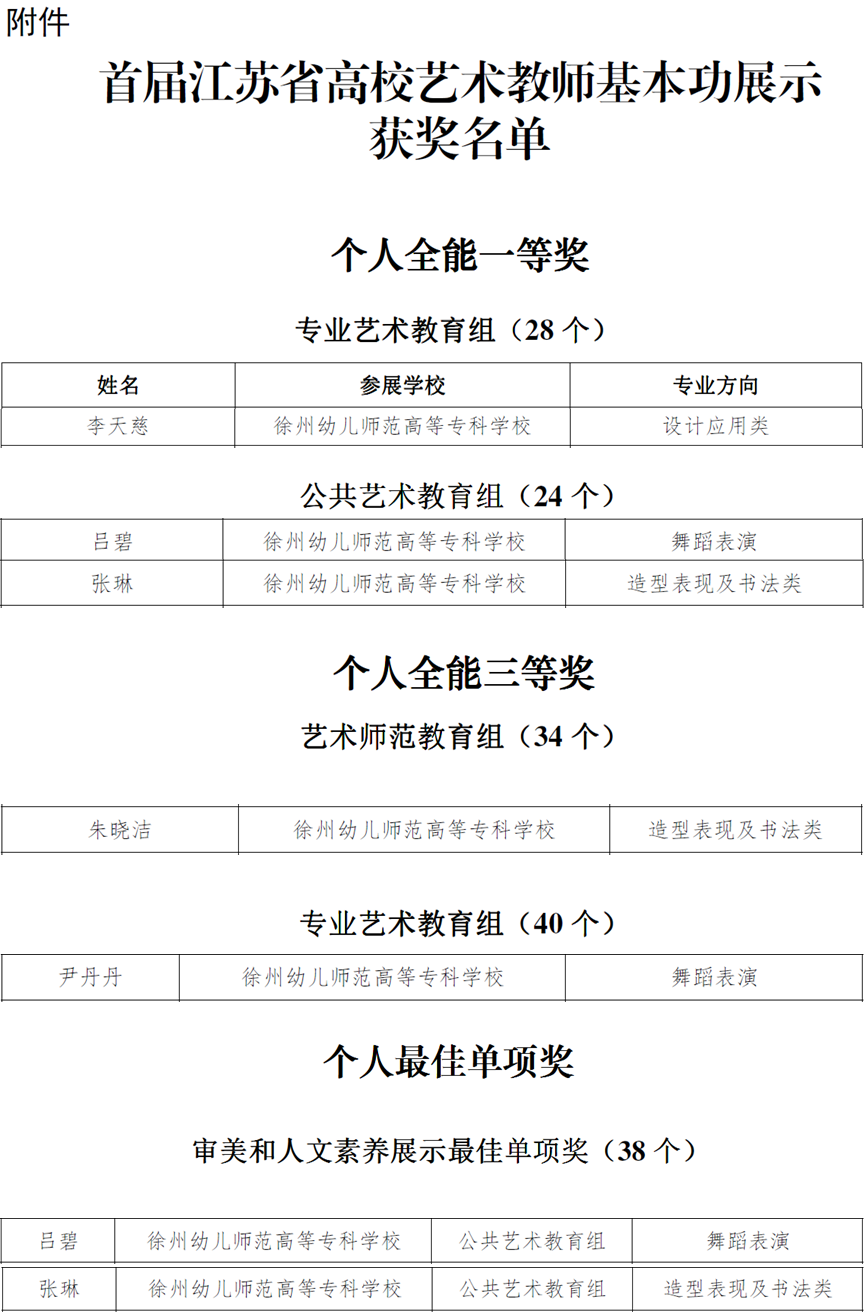 李天慈老师获设计应用类个人全能一等奖,吕碧老师获舞蹈表演个人全能一等奖,张琳老师获造型表现及书法类个人全能一等奖,朱晓洁老师获造型表现及书法类个人全能三等奖,尹丹丹老师获舞蹈表演个人全能三等奖,吕碧老师获审美和人文素养展示最佳单项奖,张琳老师获造型表现及书法类审美和人文素养展示最佳单项奖。
