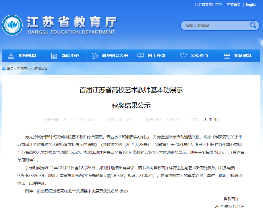 此次展示活动于2021年12月9日至10日在苏州大学举行,来自全省101所本专科院校的379位教师参加了展示比赛。展示比赛按照音乐、美术专业大类,分艺术师范教育组、专业艺术教育组和公共艺术教育组三个组别。所有参赛教师均参加了教学(微课)、专业技能、审美和人文素养(经典作品赏析)三个项目的展示。