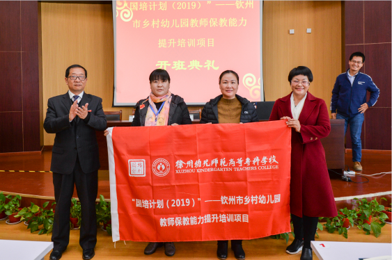 最后,王启高书记为钦州市乡村幼儿园教师保教能力提升培训班学员授班旗。结业典礼结束后,学员们与领导、老师合影留念。
