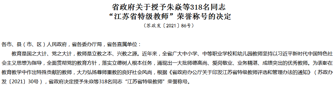 近日,江苏省人民政府印发《关于授予朱焱等318名同志“江苏省特级教师”荣誉称号的决定》,糖果派对官方