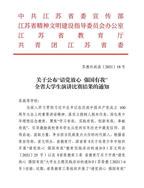 2021年12月27日,中共江苏省委宣传部、江苏省文明办、江苏省教育厅及共青团江苏省委联合下发《关于公布“请党放心,强国有我”全省大学生演讲比赛结果的通知》,糖果派对官方
