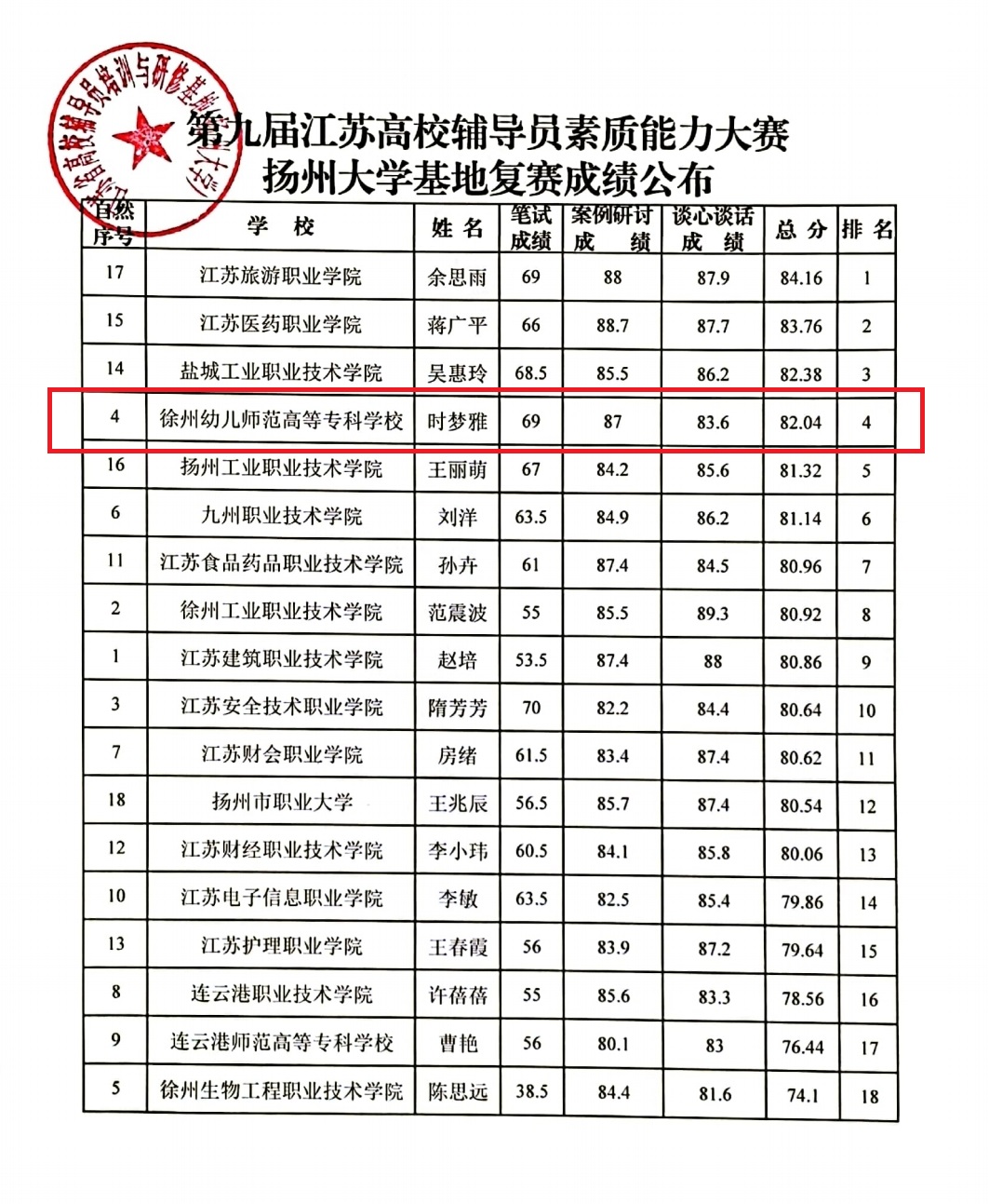 辅导员时梦雅与来自苏北地区18所高职院校的专职辅导员同台竞技,荣获基地复赛第四名(二等奖第一名),将被推荐参加由省委教育工委、省教育厅主办的决赛,实现了糖果派对官方