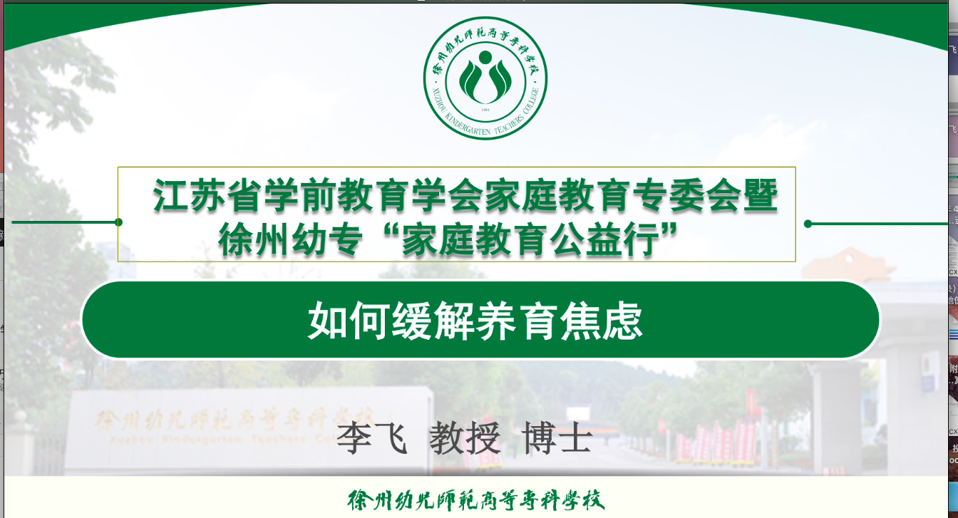幼教研究所所长、省学前教育学会家庭教育专委会主任李飞教授作了“如何缓解养育焦虑”的报告,他认为家长在养育子女的过程中因承受教育压力、孩子成长、面临不易解决的养育问题和对养育结果的不确定性时会产生养育焦虑的情绪,其成因既有心理因素、社会因素,也有情境因素。他建议家长应学会改变自己,树立正确的家庭教育理念;对孩子合理期望;尊重规律,着眼孩子的长远发展。