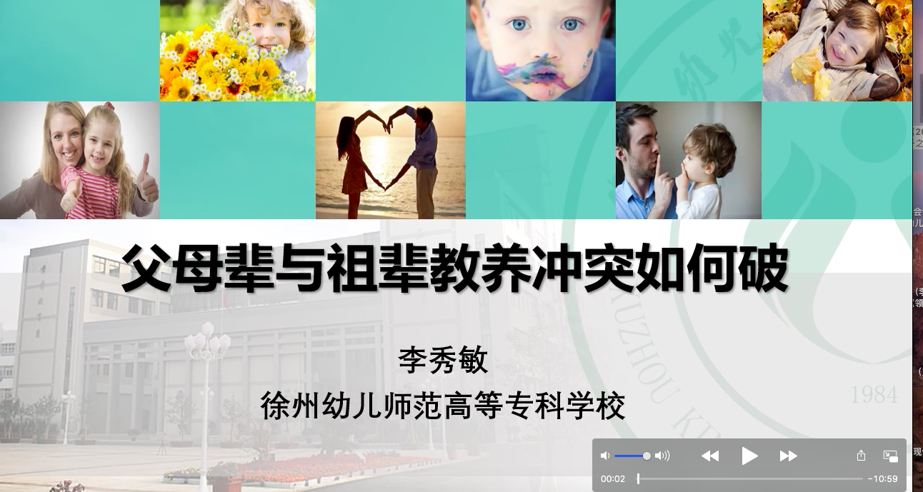学前与特殊教育学院副院长李秀敏作了“父母辈与祖辈教养冲突如何破”的报告,她指出当父母辈教育孩子的观念和祖辈发生冲突时,首先,在沟通态度上,尊重老人,明确分工,尽量多赞美,少指责;其次,面对育儿冲突,在沟通的方法上要做到有问题“私聊”,用事实说话,找科学依据,走“曲线救国”,要把握时机,需老幼兼顾等。