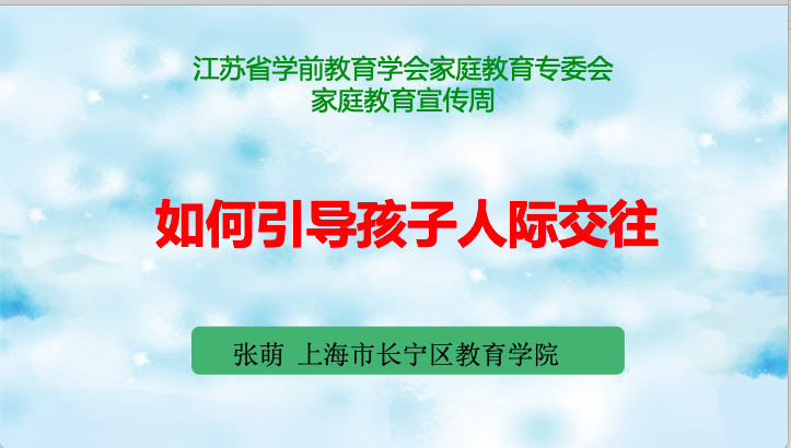 上海市长宁教育学院张萌博士作了“如何引导孩子人际交往”的报告,她认为家长指导孩子人际交往要先观察,发现孩子与小朋友相处时的问题和原因;有陪伴,跟孩子一起面对问题,经历挫折或成功;有引导,帮助孩子积极地思考解决办法;重体验,带着孩子体验恰当的相处策略和方法;强后盾,对于孩子的正确做法要给予尊重和支持;重反思,帮助孩子理性思考并及时强化。