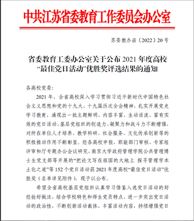 近日,在2021年度江苏省高校“最佳党日活动”评选中,音乐舞蹈学院第一党支部党日活动“入学第一课——《唱支山歌给党听》”获优胜奖。