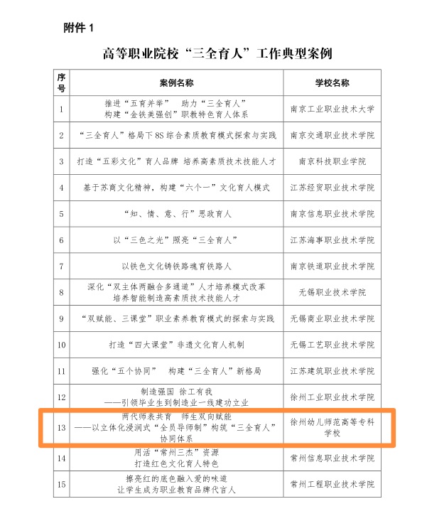 申报、材料审核、专家评审等环节,共遴选高职院校“三全育人”工作典型案例35个,旨在进一步推动“三全育人”综合改革,将思想价值引领贯穿教育教育的全过程。