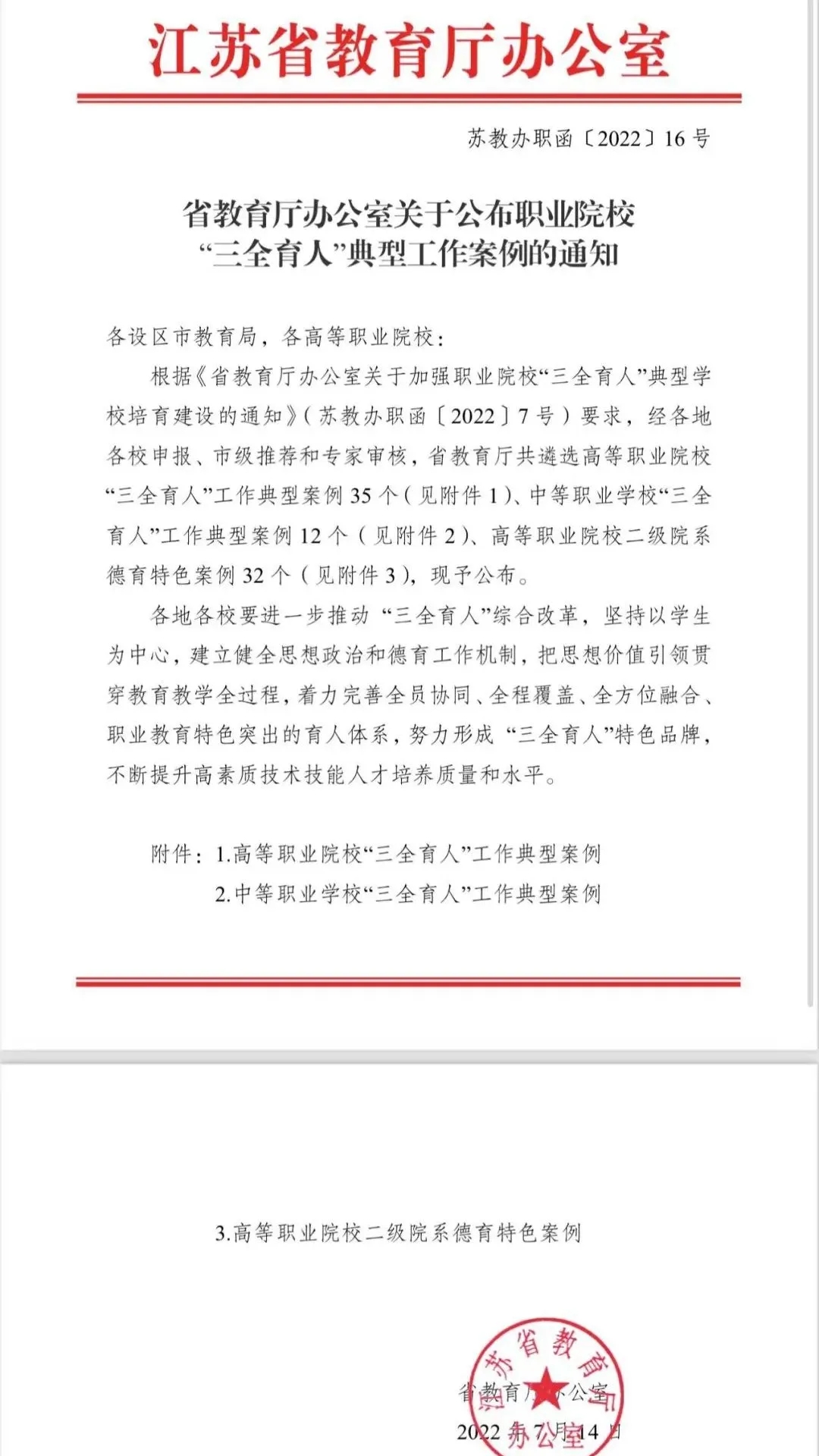 近日,江苏省教育厅办公室下发《省教育厅办公室关于公布职业院校“三全育人”典型工作案例的通知》,糖果派对官方