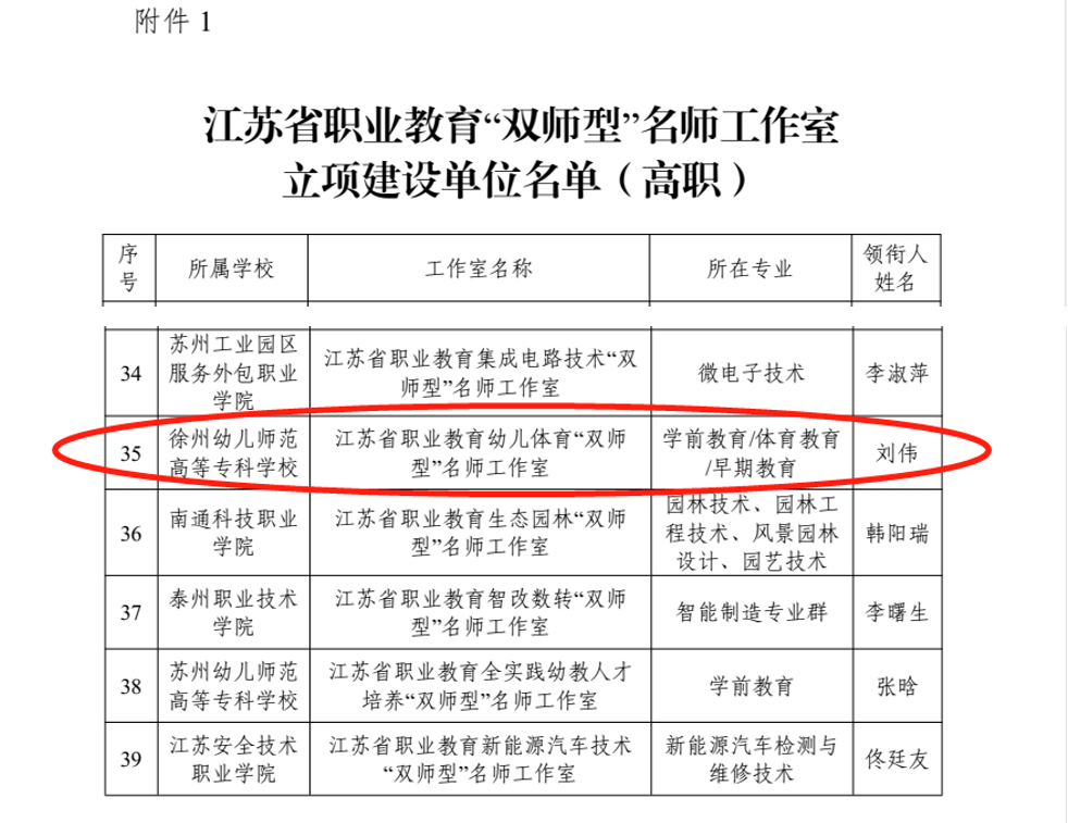 近日,江苏省教育厅公布《省教育厅关于公布首批江苏省职业教育“双师型”名师工作室和技艺技能传承创新平台建设单位名单的通知》(苏教师函〔2022〕31 号),体育学院院长刘伟领衔申报的江苏省职业教育幼儿体育“双师型”名师工作室成功获批江苏省“双师型”名师工作室立项建设。
