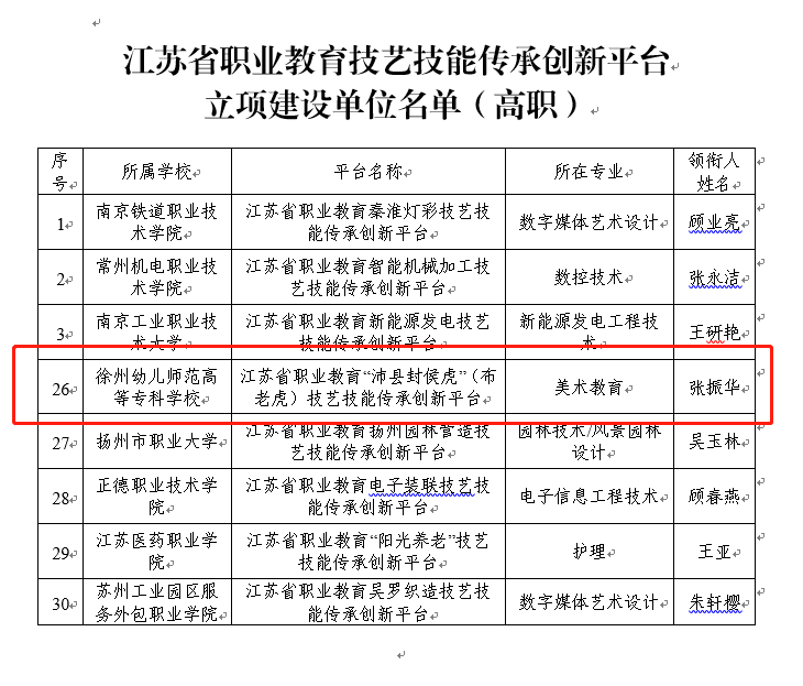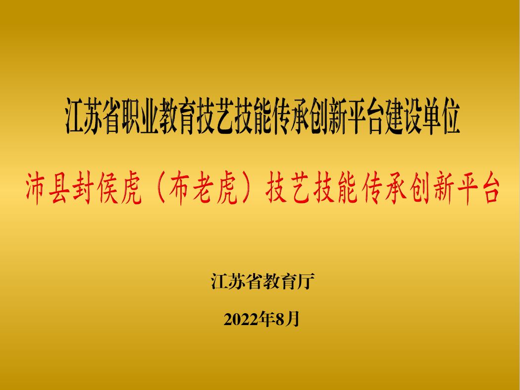 美术与设计学院、沛县泗水小学张振华教授联合申报的江苏省职业教育“沛县封侯虎”(布老虎)技艺技能传承创新平台获批立项建设。