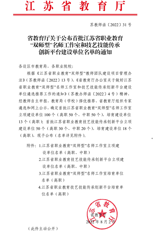 近日,江苏省教育厅公布《省教育厅关于公布首批江苏省职业教育“双师型”名师工作室和技艺技能传承创新平台建设单位名单的通知》(苏教师函〔2022〕31 号),糖果派对官方