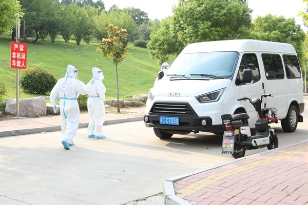 场景一为应急送诊,模拟开学返校时一学生体温异常的应急处置。在洞山校区西门演练现场,一返校学生体温检测时呈现异常,到隔离点复测。校医二次复测该生为体温38.5℃时,随报告给现场总指挥,总指挥遂指令安排专用车辆送诊。相关部门及院系安排车辆人员送诊该生至定点医院,同时对现场进行消杀。后该生经诊断后排除新冠病毒感染或疑似感染,由送诊专车接返后送入校内隔离点,遵照医嘱进行隔离观察,消毒人员对送诊车辆进行消毒处理,相关人员对隔离人员开展心理辅导工作。