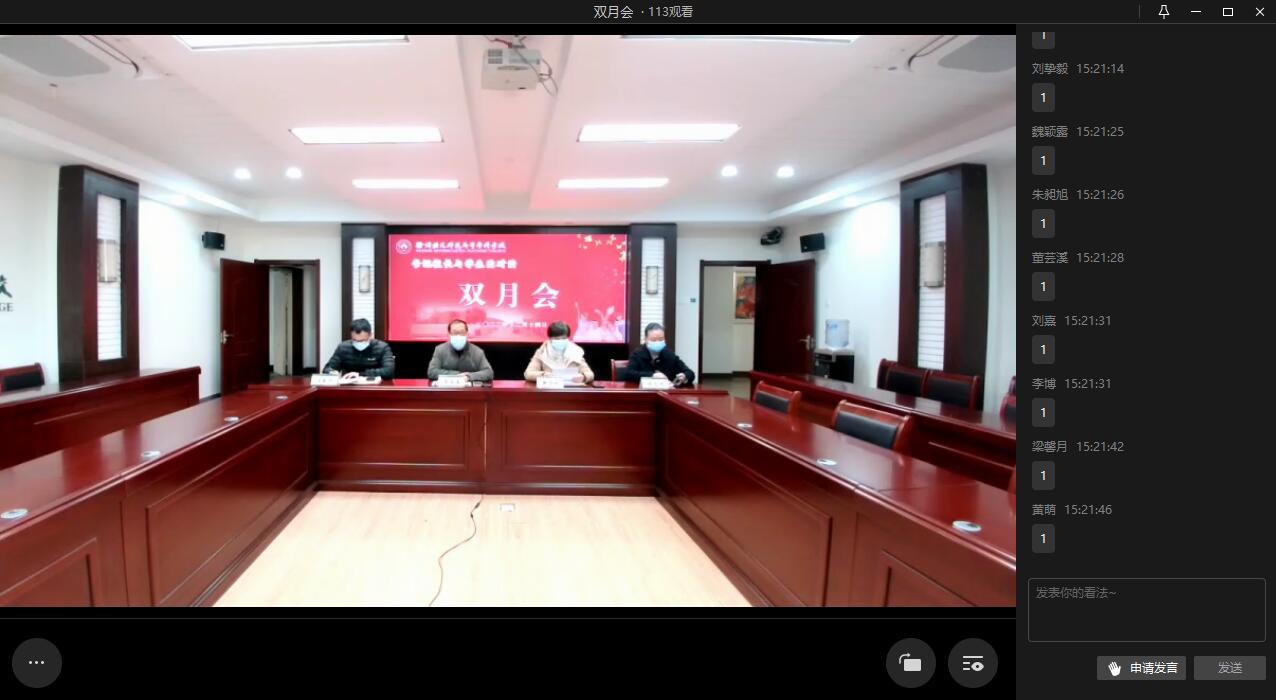 以线上直播形式召开了2022年第四场“书记校长与学生面对面”双月会。会议由校党委委员、纪委书记王启高主持,教务处、学工处、后勤处等相关职能部门负责人和各班学生代表参加了会议。