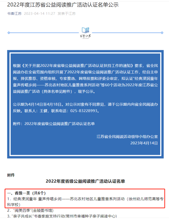 王宁、于丹丹申报的“经典滋润童年童声唱响乡间——苏北农村地区儿童推普系列活动”以第1名的成绩荣获省级一类活动认证。