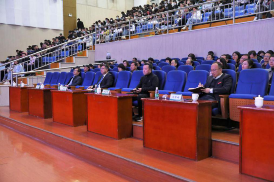 首期“德能并修大讲堂”活动——全国道德模范报告会在演播厅举行。报告会由校党委委员、副校长刘芳铭主持,党委书记崔成前,党委委员、副校长邓宪亮,党委委员、纪委书记王启高出席,全体教职工和健康服务与管理学院的400余名学生共同聆听了报告。