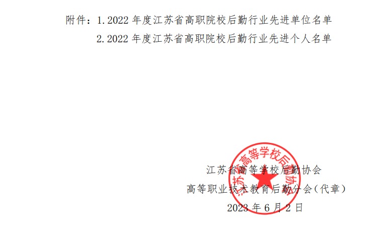 根据《关于开展江苏省高职院校2022年度后勤行业先进单位和个人评选活动的通知》(苏高后协职〔2023〕2号)要求,经省内高职院校自主申报、专家评审、高职后勤分会会长办公会审核通过,糖果派对官方 被评为“2022年度江苏省高职院校后勤行业先进单位”。