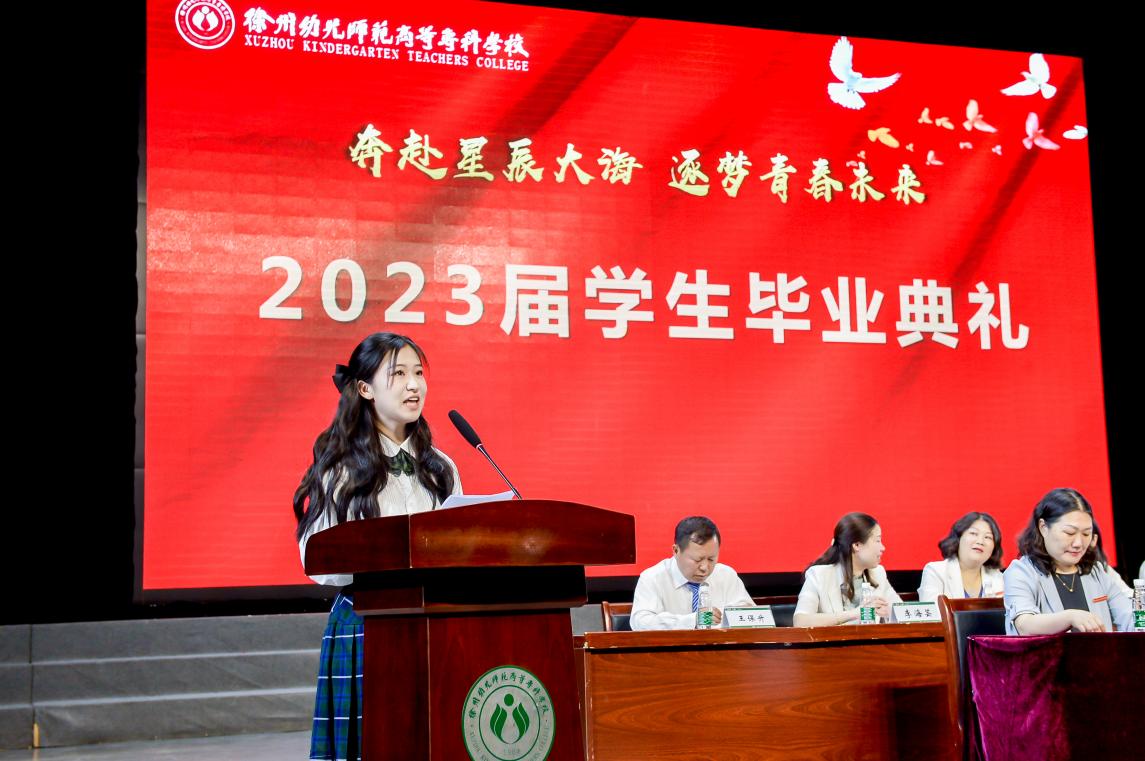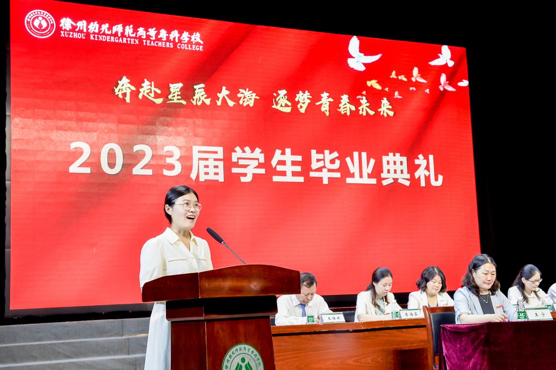 语言文化学院20级英语教育2班徐海洋作为优秀毕业生代表发言,她分享了在校期间的成长经历,表达了对母校、师长、父母的感恩,号召全体同学要坚持所爱、发挥所长,勇敢迎接未来,创造属于自己的精彩人生!学前与特殊教育学院辅导员尹宏展作为教师代表发言。她希望同学们传承“崇师、尚美、立人”校训,赓续“特别能吃苦、特别能战斗、特别能奉献”的徐幼精神,在合格建设者和可靠接班人的成长道路上书写新的光荣与梦想。