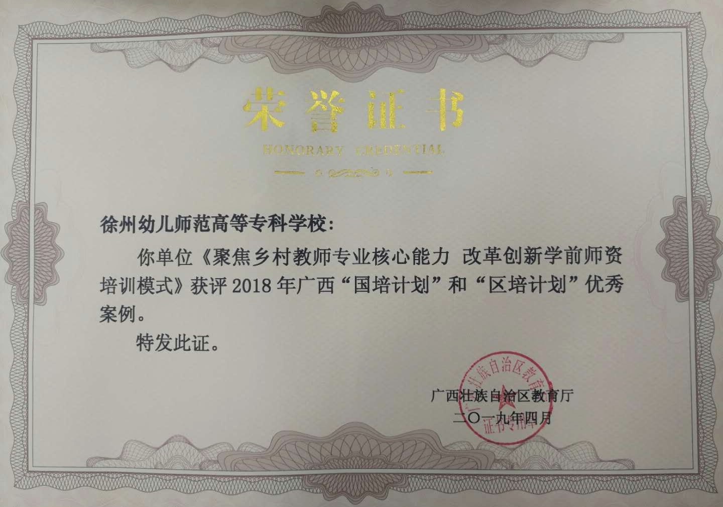 申报的案例《聚焦乡村教师专业核心能力 改革创新学前师资培训模式》,经过专家严格评审,荣获2018年广西“国培计划”和“区培计划”优秀案例。