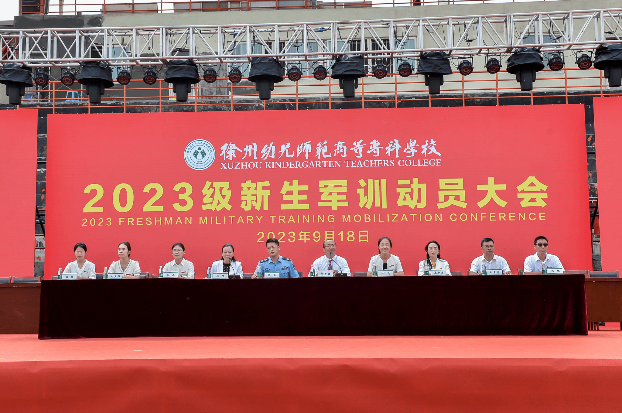 空军勤务学院承训官兵代表刘俊奇班长发言。他表示,全体承训官兵一定会科学组训、正规施训,确保质量和安全,高标准完成本次军训任务。国际教育学院2023级学前教育(中外合作办学)班的吴雨欣代表全体学生承诺,作为新时代的大学生,要勿忘惨痛历史,铭记振兴中华的誓言,志存高远,脚踏实地,发奋图强,认真对待这次军训, 发扬徐州幼专的“四特”精神,圆满完成军训任务。接着,承训教官进行了队列展示,他们的飒爽英姿展现了新时代的军人风貌。