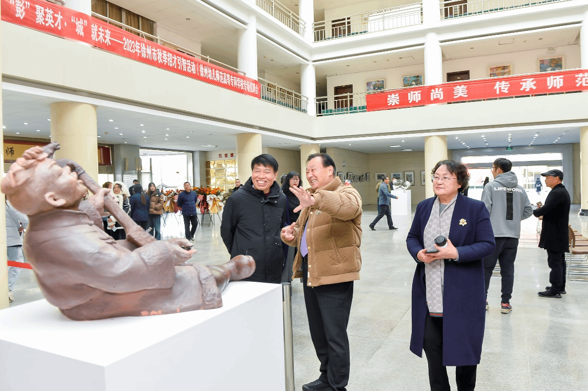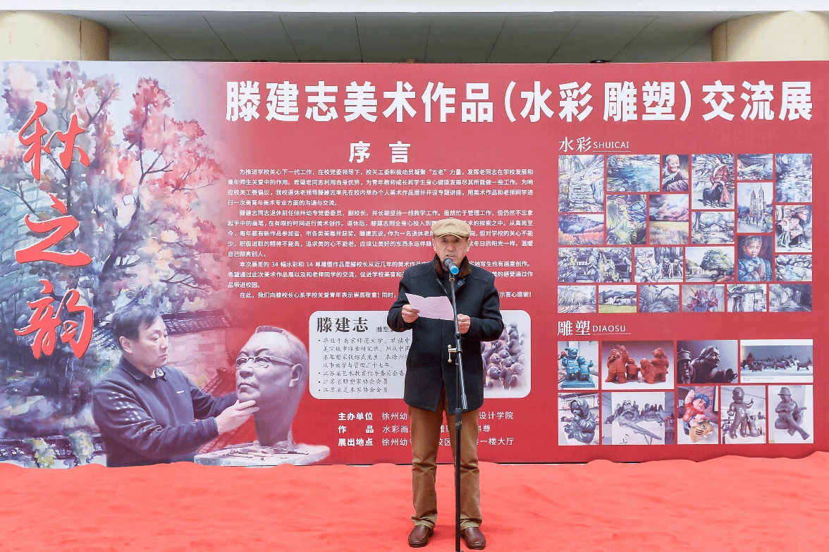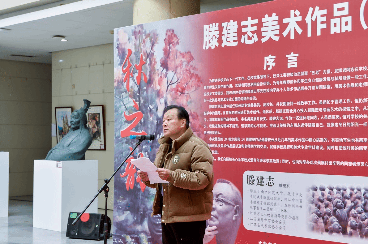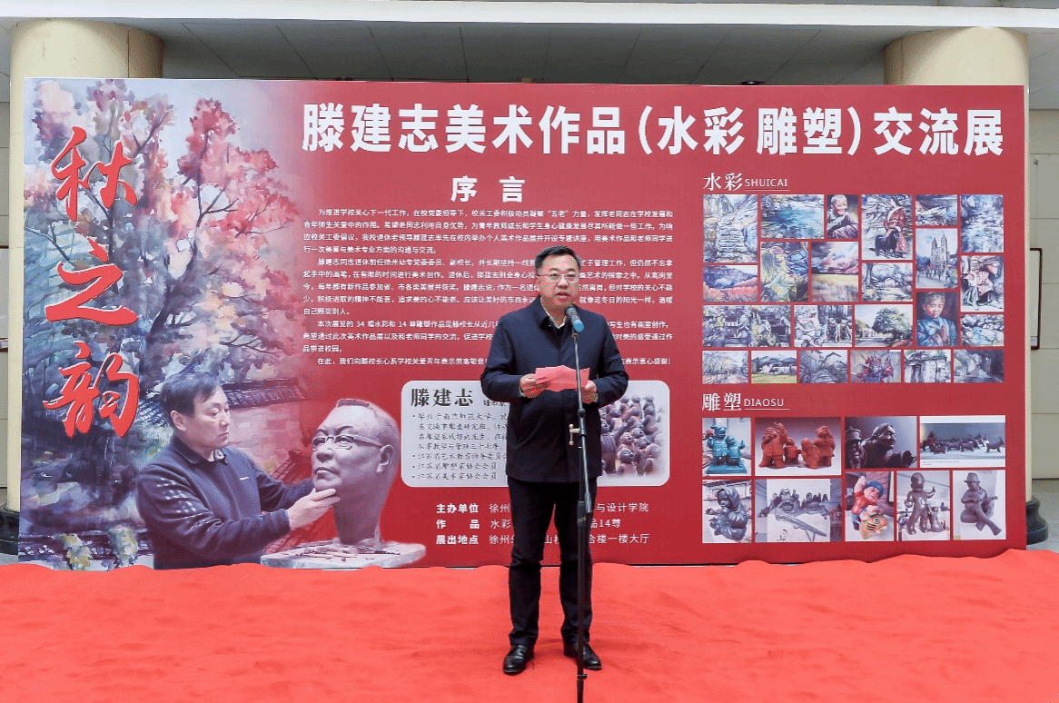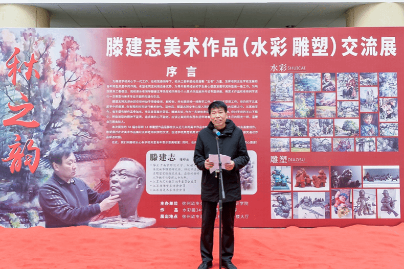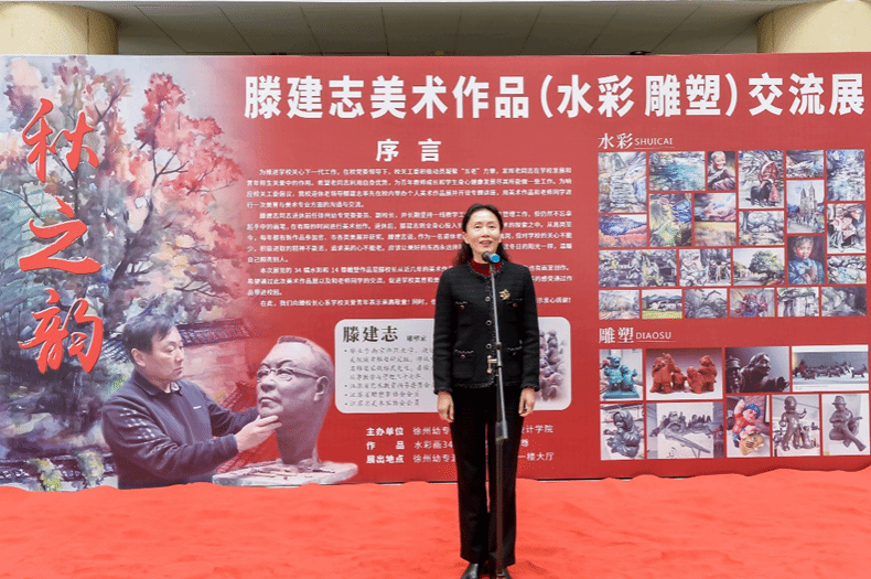 朱勇前在致辞中说,滕建志先生是徐州市知名的雕塑家,长期坚持美术创作,为徐州的城市雕塑建设和徐州美术事业的发展进步做了大量的工作,并取得优异成绩。滕建志先生是徐州唯一一位举办个人雕塑作品展的雕塑家,这是徐州雕塑界的一大幸事。他希望学院老师和同学多关注徐州美术动态,积极参加徐州市相关美术活动,多与美协和其他院校开展学术交流,为徐州培养更多美术人才,把徐州美术事业推向更高水平。