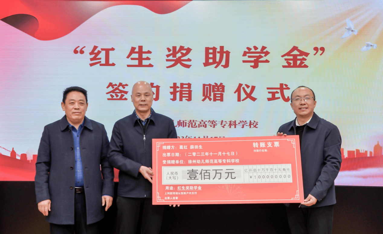 葛红表示,作为徐州幼专的老朋友,一直关注学生的成长和发展,希望通过“红生奖助学金”的设立,惠及更多贫困家庭,让更多贫困家庭的优秀学生享受优质教育。薛田生表示将以此为契机,广泛宣传,积极动员社会上更多的优秀企业家和爱心人士投入到教育慈善事业中,助力教育帮扶工作持续健康发展。