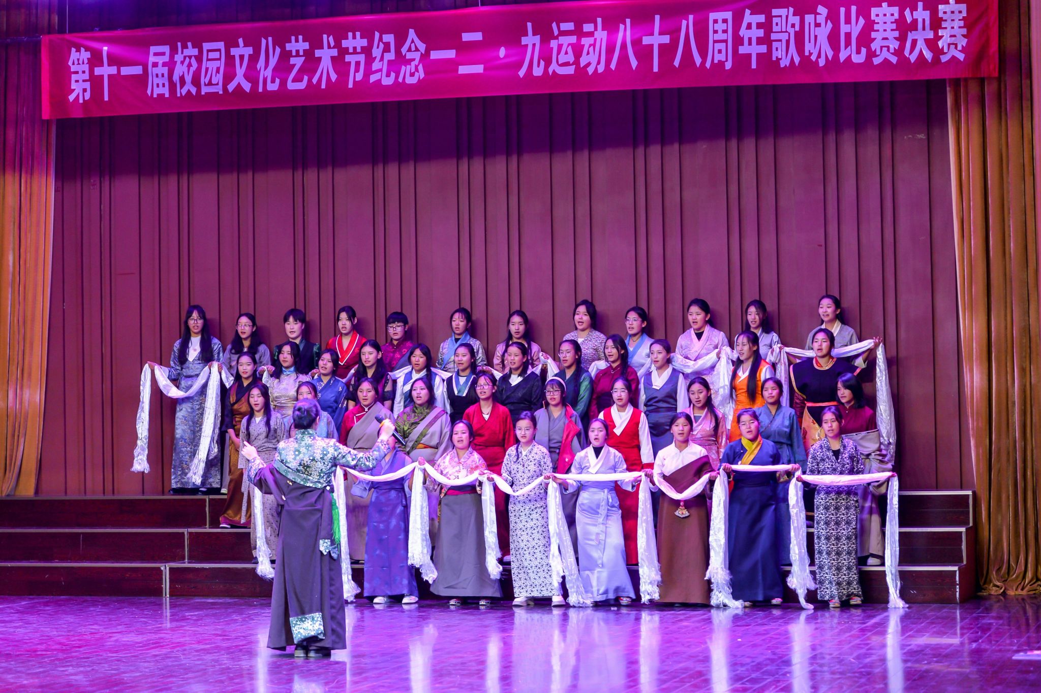 本届歌咏比赛分为专业组和非专业组两场进行,共有64个班级参赛,经过初赛选拔,24个班级进入了决赛。比赛中,各班同学精神饱满、倾情演绎,《歌唱祖国》《我和我的祖国》《国家》《再唱山歌给党听》《万疆》等歌曲气势磅礴,饱含对党和国家的无尽热爱和依恋,唱出了为党和国家事业贡献青春力量的决心和意志;《如愿》《灯火里的中国》《阳光路上》《少年中国说》《错位时空》《奔跑》等歌曲振奋人心,讴歌了新时代党和国家取得的辉煌成就,唱响了青年学子坚定不移跟党走,砥砺奋进新征程的时代强音。整场比赛气势恢宏、高潮迭起,台上的同学的倾情表演深深感染了现场师生观众,赢得阵阵热烈掌声。
