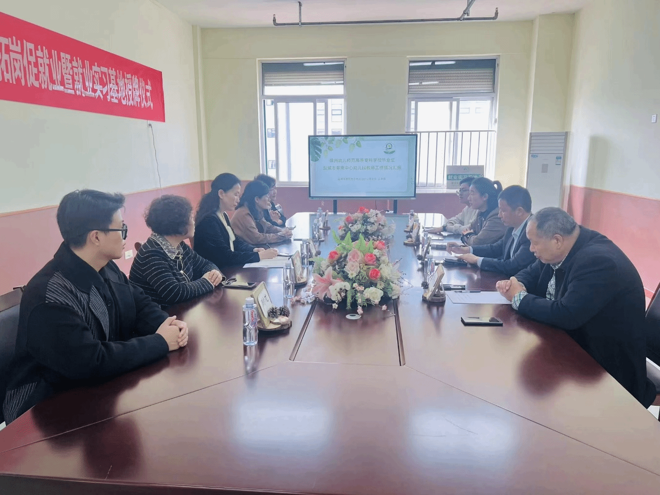 与秦南中心幼儿园签订就业实习基地合作协议,孙卫芳向幼儿园授予就业实习基地牌匾。