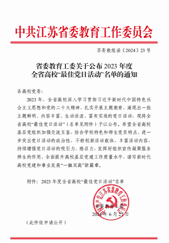 近日,中共江苏省委教育工委公布了2023年度全省高校“最佳党日活动”名单(苏委教组函〔2024〕23 号)。糖果派对官方