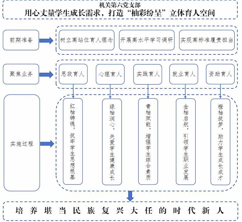 机关第六党支部由学生工作处、招生就业处、团委三个部门14名党员组成。2023年,机关第六党支部全面贯彻落实党的二十大精神和习近平总书记关于教育的重要论述,坚持立德树人,聚焦主责主业,通过树立高站位育人理念、开展高水平学习实践,实现高标准履责担当。党支部着力打造了“用心丈量学生成长需求,打造‘柚彩纷呈’立体育人空间”系列主题党日活动,精心开展了“红柚”铸魂、“绿柚”润心、“青柚”赋能、“金柚”启航、“橙柚”筑梦等百余项特色活动,有效提升了思政育人深度、心理育人温度、实践育人广度、就业育人力度、资助育人精度。主题党日活动既突出了“党务+业务”的鲜明特色,又实现了“党建+育人”的活动内涵,相关成果及活动成效先后20余次在国家、省市级媒体宣传报道,品牌效应逐步形成。