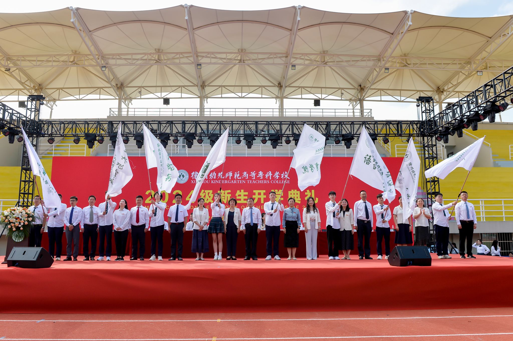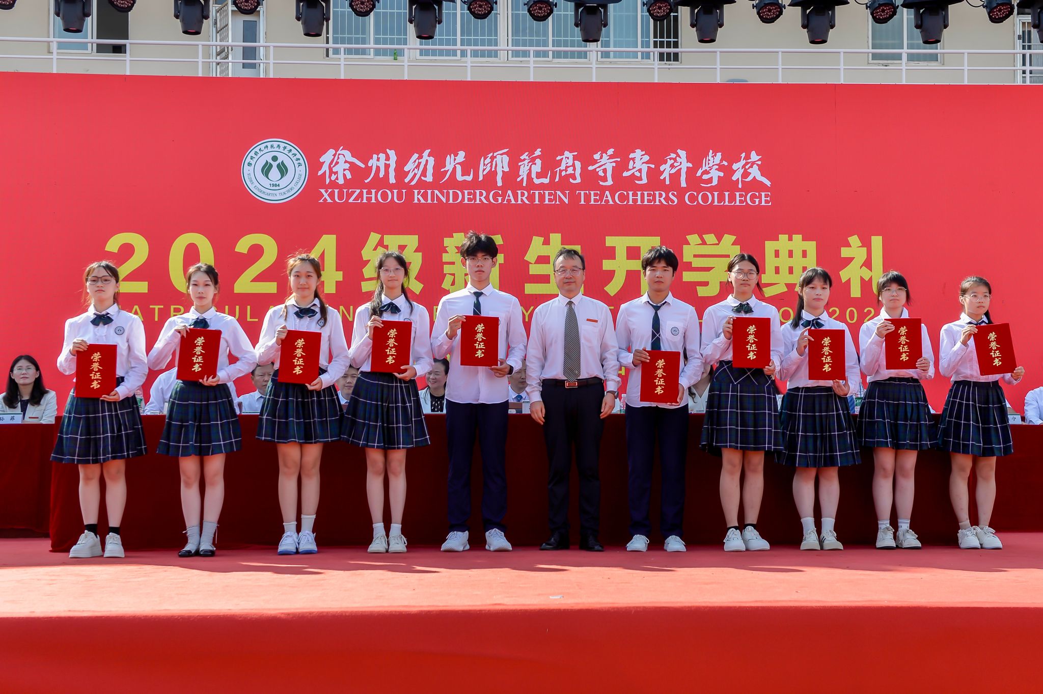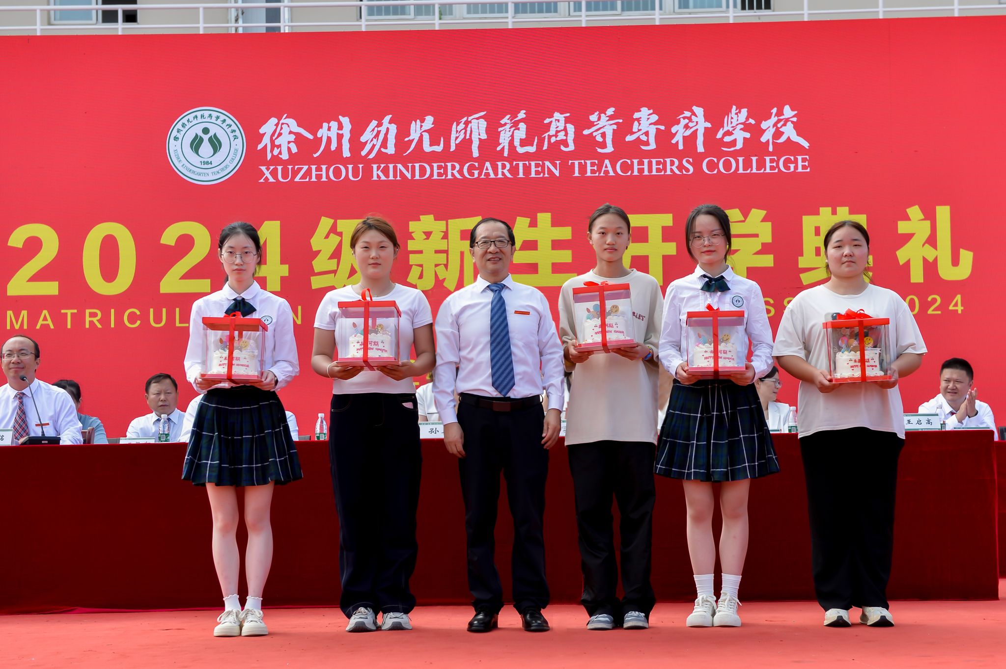 曹利群宣读了2024级新生奖学金表彰决定,邓宪亮为奖学金获得者颁奖。教师代表音乐舞蹈学院孙玉柱教授发言,他希望同学们树立远大理想、塑造高尚品德、学好专业知识、磨砺意志品质、珍惜同窗情谊,用勤奋与智慧铸就辉煌人生,谱写青春华章。24级应用英语班董洁妤、23级智慧健康养老服务与管理1班张美轩分别作为新老生代表发言。王启高为当天生日的5位新生送上生日蛋糕,在场师生齐唱生日歌,温馨一刻祝福满满。各学院党政负责人为新生代表佩戴校徽、颁授院旗。胸佩熠熠闪光的校徽,手握猎猎飘扬的院旗,昭示着2024级新生的大学生活正式扬帆起航。最后,师生共同观看了迎新短片《启航,徐幼》。