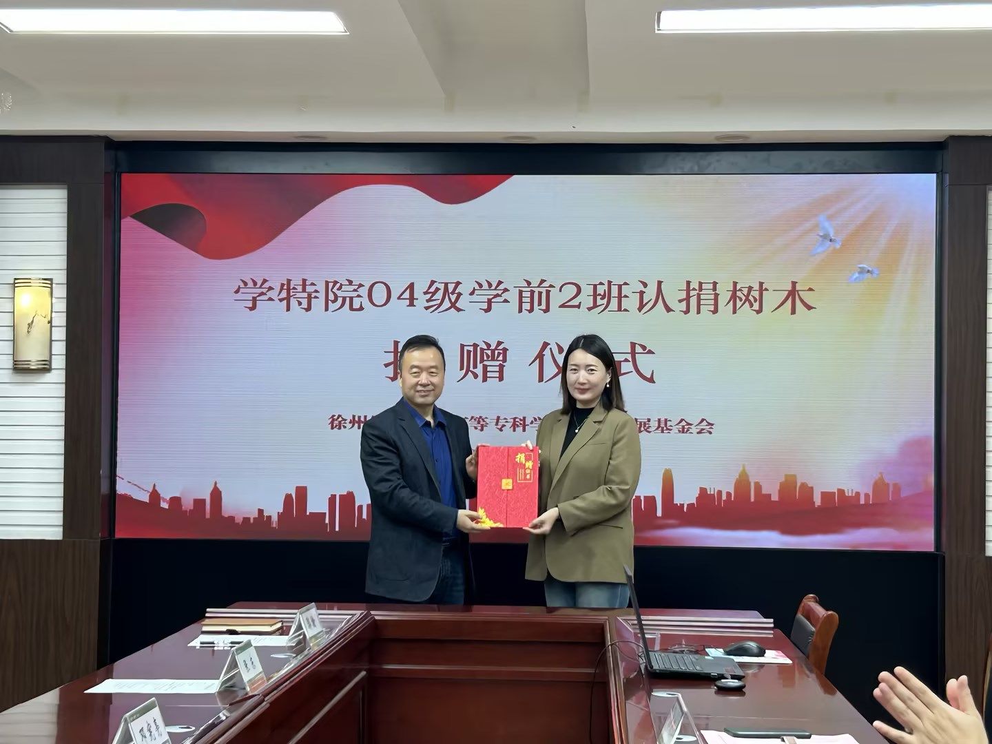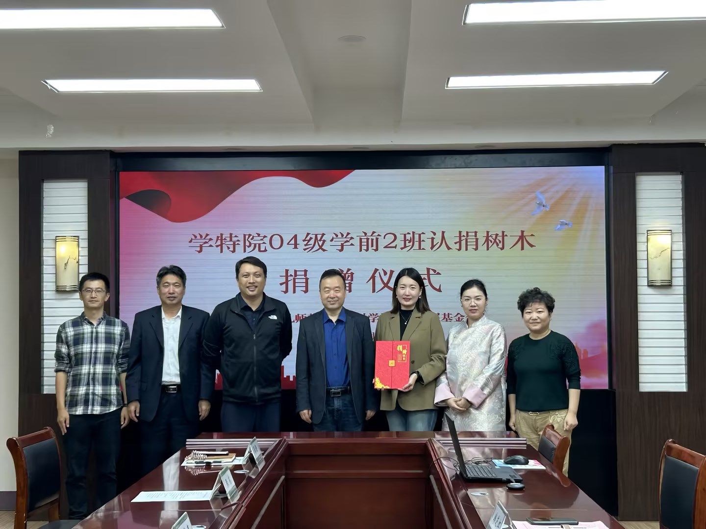 捐赠仪式上,张东代表基金会接受捐赠,邓宪亮向04级学前2班颁发捐赠证书。活动最后,全体参会人员合影留念。