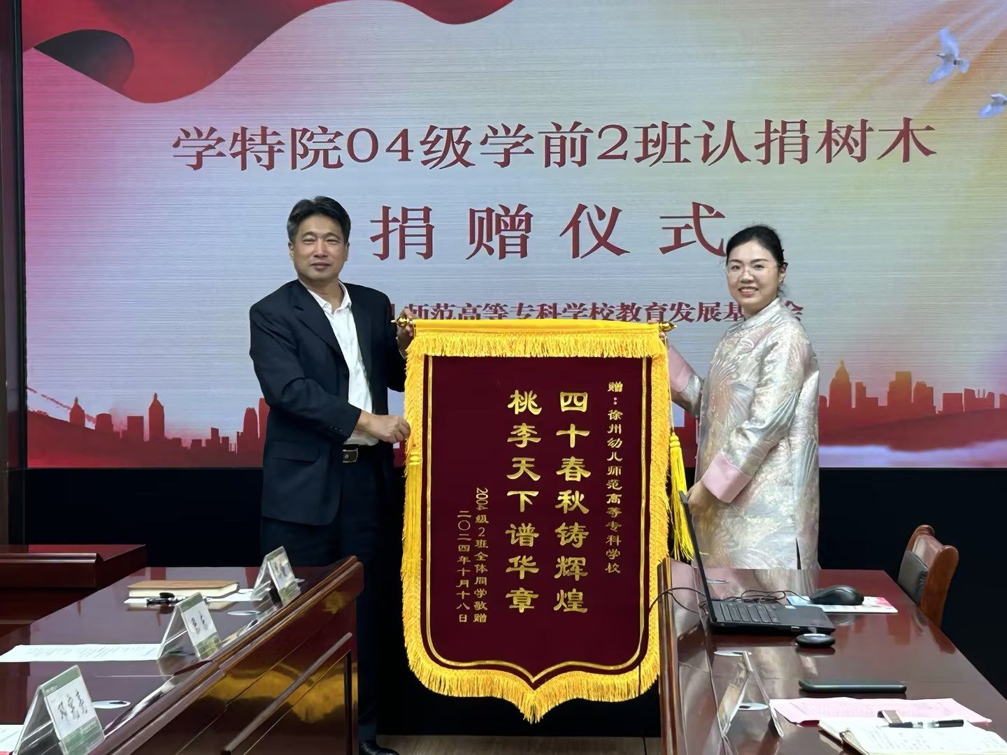 学前与特殊教育学院2004级学前教育专业2班校友代表韩芝红、张袁君,党委委员、副校长、教育发展基金会理事长邓宪亮,招生就业工作处处长、教育发展基金会秘书长张东,班主任代表刘伟、张明睿参加捐赠仪式。捐赠仪式由教育发展基金会办公室主任郭渝主持。