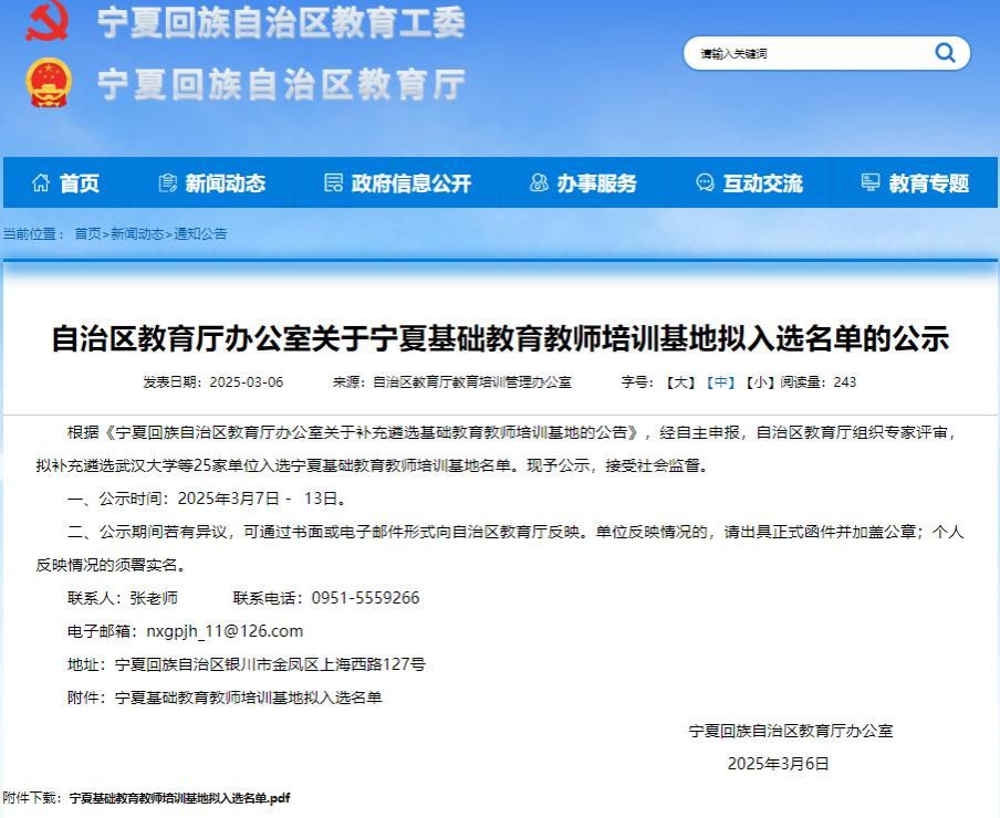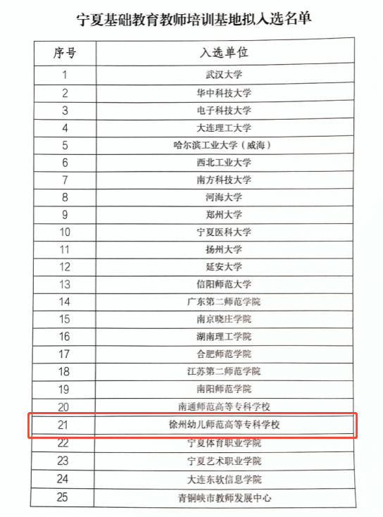 成功申报并入选“宁夏基础教育教师培训基地”,是唯一一所幼儿师范类高职高专入选院校。