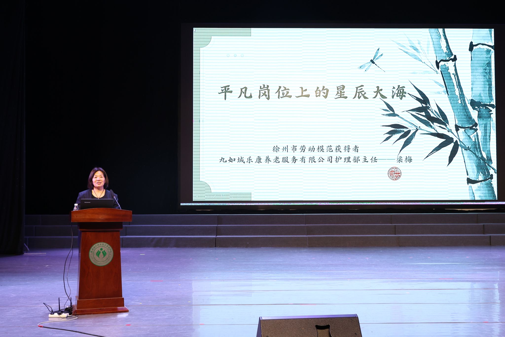 “德能并修大讲堂”劳动模范事迹报告会在洞山校区演播厅举行。徐州市劳动模范、徐州九如城养老服务管理有限公司护理部主任梁梅作专题报告,校党委副书记、校长孙卫芳,徐州九如城养老服务管理有限公司总经理王明丽出席活动。报告会由健康服务与管理学院副院长王晓斐主持,全体教职工及该院师生代表180余人参加。