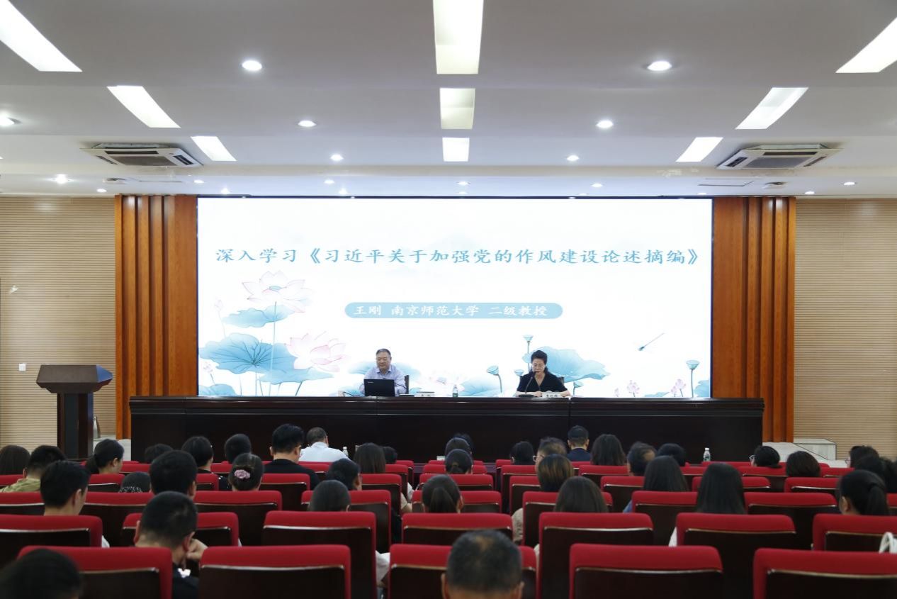 特邀南京师范大学马克思主义学院院长王刚教授在碧螺校区学术报告厅作题为《深入学习<习近平关于加强党的作风建设论述摘编>》的专题报告。在校的领导班子成员,干部、党员代表和民主党派代表参加会议。校党委副书记曹利群主持报告会。