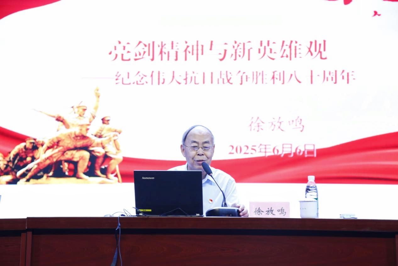 报告会邀请了江苏师范大学原党委书记、市关工委“五老”宣讲团顾问徐放鸣教授担任主讲嘉宾。他以《亮剑精神与新英雄观》为题,从引人注目的“亮剑现象”、另类英雄的形象塑造、亮剑精神的核心内涵等三个方面为大家阐述了亮剑精神的深刻内涵和时代价值。徐放鸣教授的讲座深入浅出、精彩生动,通过对经典影视剧《亮剑》主人公李云龙的人物剖析,引导现场观众深刻理解了“敢作敢为、有勇有谋、抢抓机遇、锐意创新、决战决胜”的“亮剑”精神。他勉励青年学生,在学习和工作中,要有锐意进取的精神状态,严谨科学的求实精神,开拓创新的勇气和胆识,遇到困难时,要有放手一搏的豪气,狭路相逢勇者胜,敢于亮剑、善于亮剑,才能收获最后的胜利。