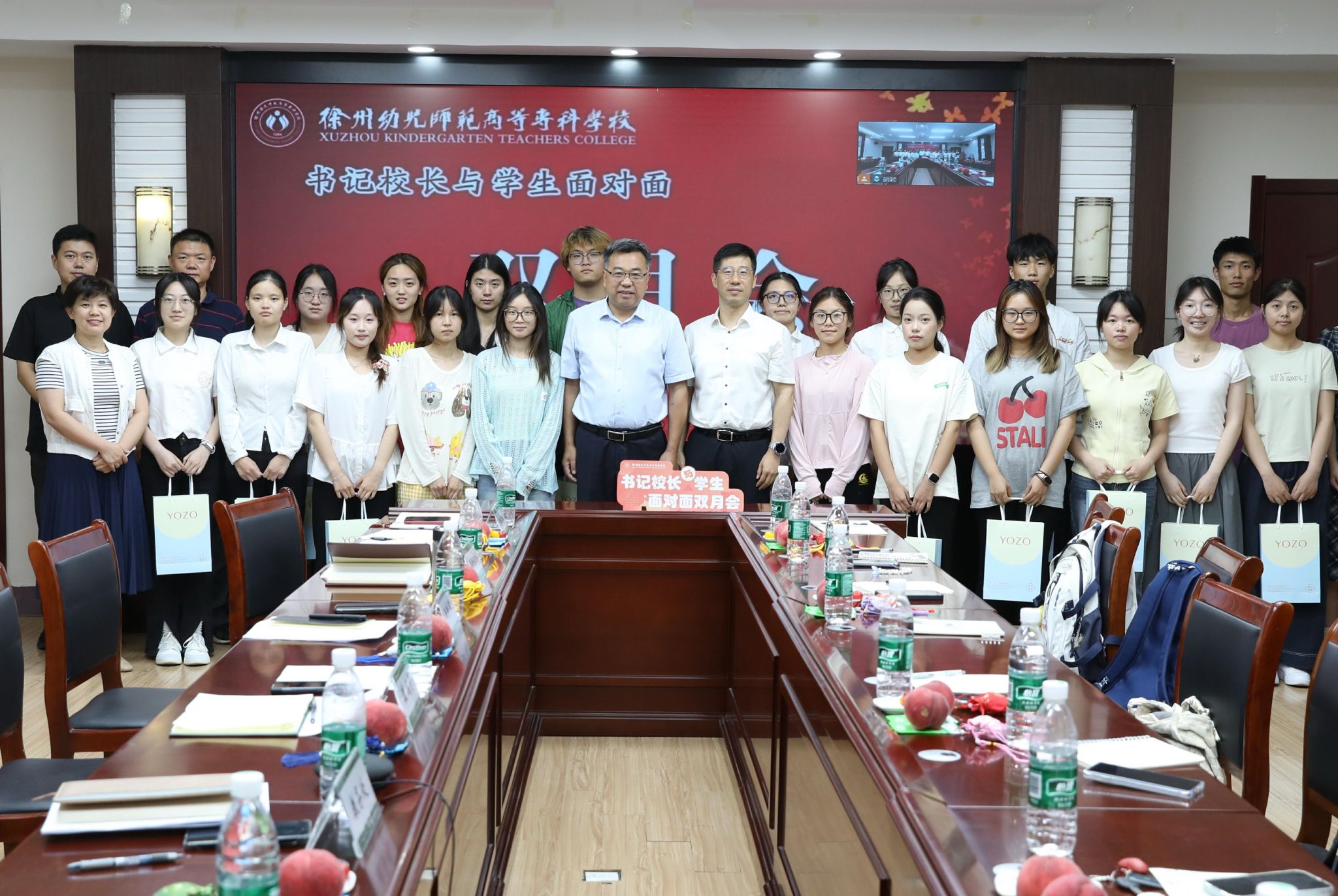 为参会师生准备了悟生园及“青柚”劳动实践责任田种植的桃子和小番茄等水果,师生一边品尝劳动果实,一边展开了暖心交流。交流活动后,崔成前、王铁军为与会学生赠送精美礼包并合影留念。