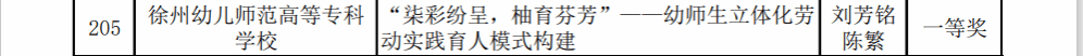 申报的两个项目脱颖而出,全部获奖。其中,由刘芳铭、陈繁主持的项目《“柒彩纷呈,柚育芬芳”——幼师生立体化劳动实践育人模式构建》荣获一等奖;由黄凯萍主持的项目《“乐享银龄”——养老专业学生社区服务劳动育人实践》获得二等奖。